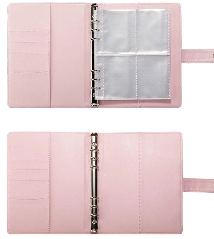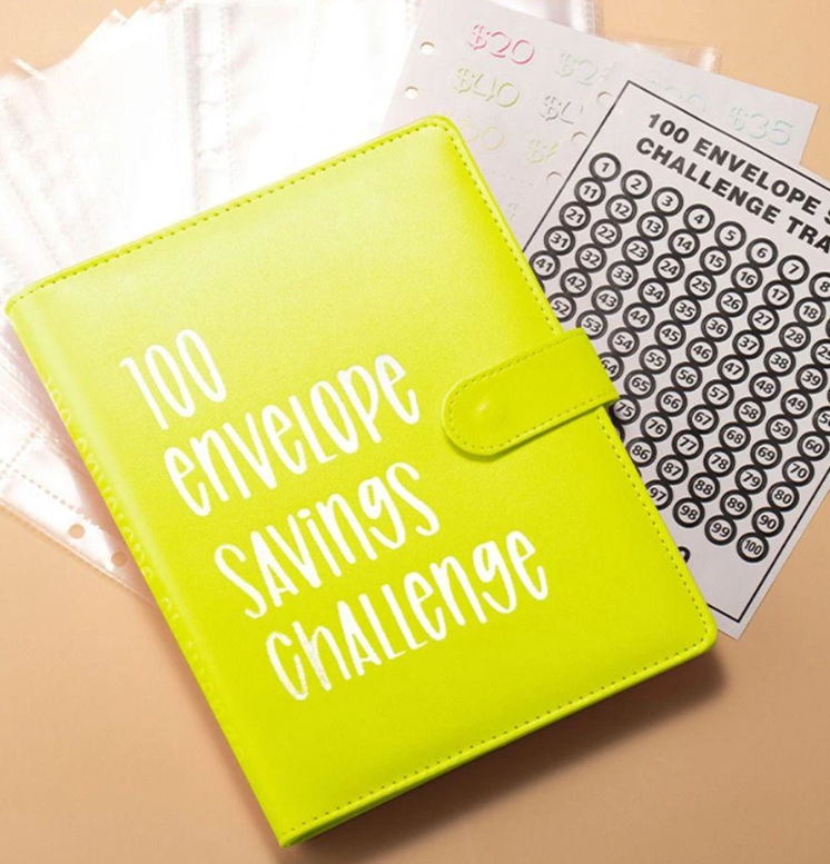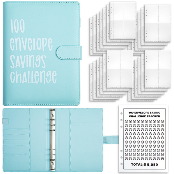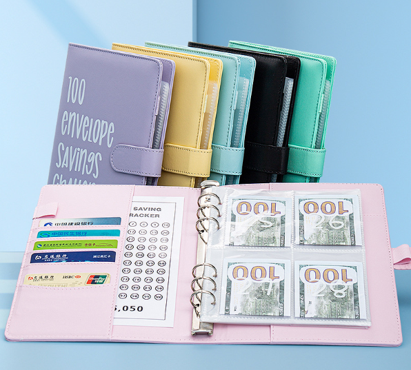 Bộ sản phẩm bao gồm một bìa da giả khổ A5, 4 công cụ theo dõi thử thách tiết kiệm với số tiền khác nhau và 13 phong bì đựng tiền mặt trong suốt được in