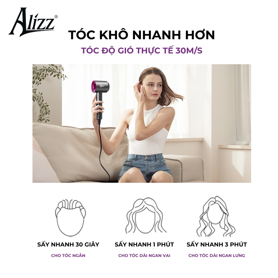 - Tốc độ gió mạnh: Với tốc độ gió đạt tới 30m/s, máy sấy giúp làm khô tóc nhanh chóng mà không làm tổn hại đến chất lượng tóc.