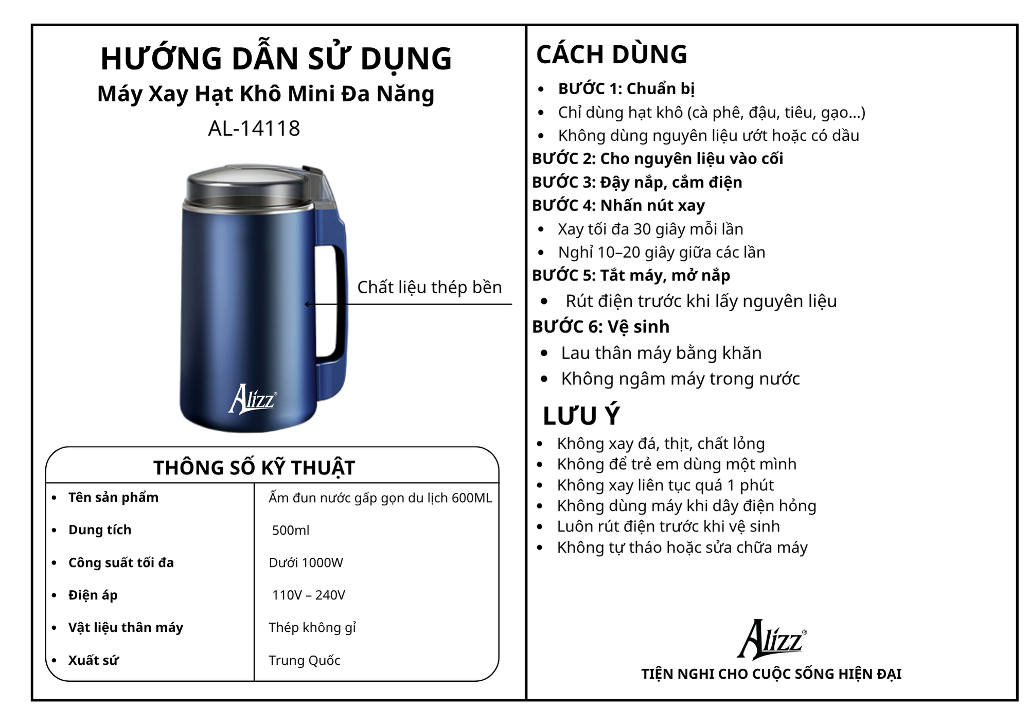 Máy xay hạt khô mini đa năng ALIZZ AL-14118 là giải pháp tiện lợi và hiệu quả cho mọi gian bếp – giúp bạn chế biến nguyên liệu nhanh chóng, an toàn và tiết kiệm.