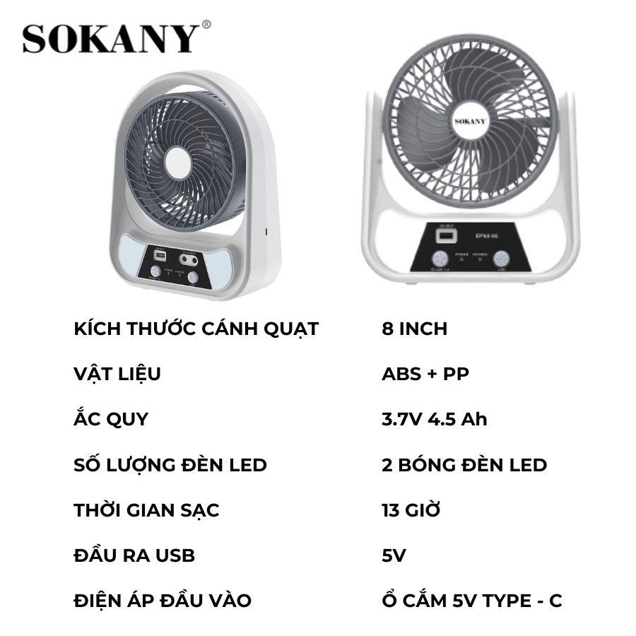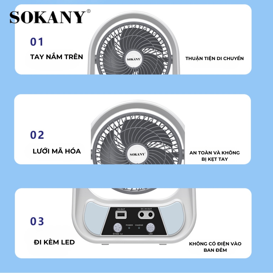 Với tất cả những tính năng trên, Quạt Để Bàn Sạc Điện SOKANY SKN-14122 là sự lựa chọn lý tưởng cho những ai mong muốn một sản phẩm quạt tiện ích, tiết kiệm năng lượng và bảo vệ sức khỏe.